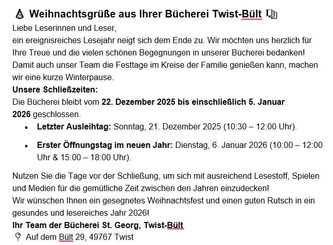 Ferien! Wir machen Ferien! Unsere Bücherei bleibt in den Sommerferien vom 18.07.2025 bis zum 11.08.2025 und Sonntags geschlossen. Wir wünschen eine schöne Sommerzeit!